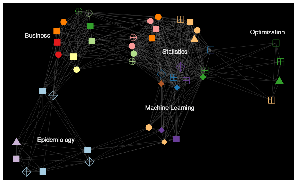I have spent many years surrounded by statistical problems in diverse fields, and I have both used and taught a diverse array of tools to solve them. This includes classical, nonparametric, and Bayesian statistics as well as optimization, machine learning, and neural networks. My projects have analyzed cross-sectional, time series, and multilevel data. This network image condenses and displays the diversity of my work. Each node represents an analysis while their color corresponds to a class of method used and shape to a style of analysis (theory, methodology, modeling, etc). Edges connecting analyses link them by field. As an additional visual guide, some labels are provided to node groupings.